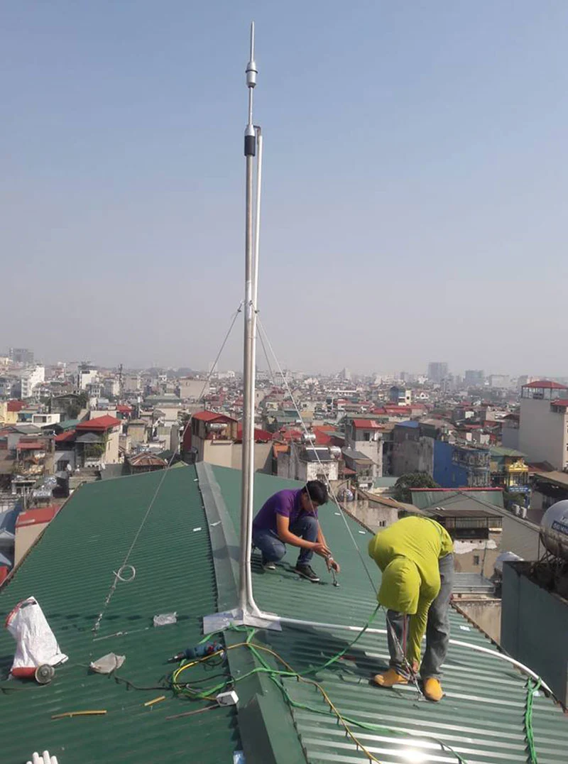 - Lắp đặt kim thu sét & dây dẫn thoát sét: Kim thu sét được lắp trên cột đỡ chắc chắn, cao hơn ít nhất 2 mét so với điểm cao nhất của công trình. Dây dẫn thoát sét bằng đồng hoặc nhôm chuyên dụng được thi công theo đúng tiêu chuẩn kỹ thuật.